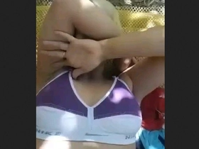 This video features a stunning girl named Dehati who spits on her attractive breasts